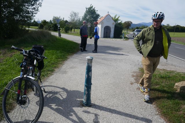 In Neusiedl am Steinfeld trafen wir dann Andreas, er wollte ein paar Kilometer mit uns mitradeln. Leider ist es wegen einem übersehenen Poller zu einem schweren Sturz gekommen. Aus meiner Sicht hat sich das etwa so ereignet: die ersten Vier radeln beengt auf eine Biegung zu – die Sicht nach vorne ist eingeschränkt, Fritz und ich folgen im 30m Abstand…… Der Erste fährt zügig am Poller vorbei, Christoph als zweiter kann sein Rad noch zu Seite ziehen und kommt knapp vorbei, Andreas als dritter hatte keine Chance mehr, sein schweres Rad war nicht mehr zu bändigen und er kollidiert so stark mit dem Poller, dass der sogar aus seiner Verankerung reißt.