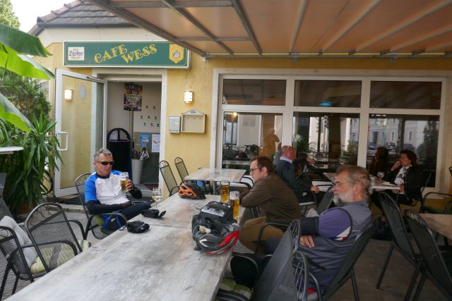 Dort dauerte es etwas länger, erst gegen 14:00 setzten wir unsere Tour fort. Ab Wr. Neustadt ging es auf den beiden bekannten Radwegen Thermenradweg und Triestingradweg (Eurovelo 9 u. 9a) , mit nur noch einer Trinkpause in Trumau (Cafe Wess), bis zu den Kaminstuben in Mannswörth wo wir die Tour um 18:30 beendeten.